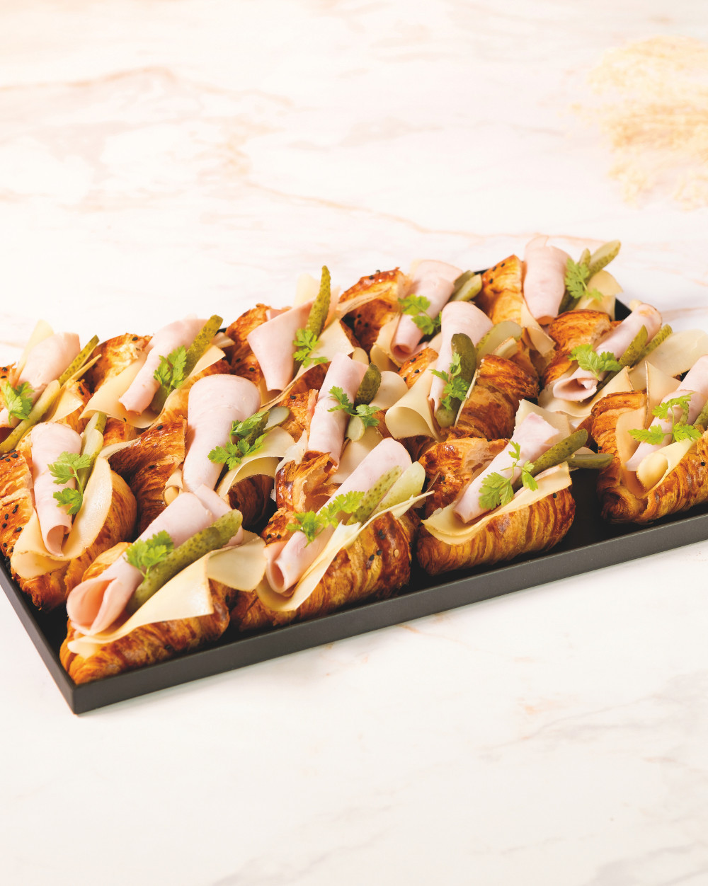 Pure butter puff pastry, poultry ham, basil pesto, pickles