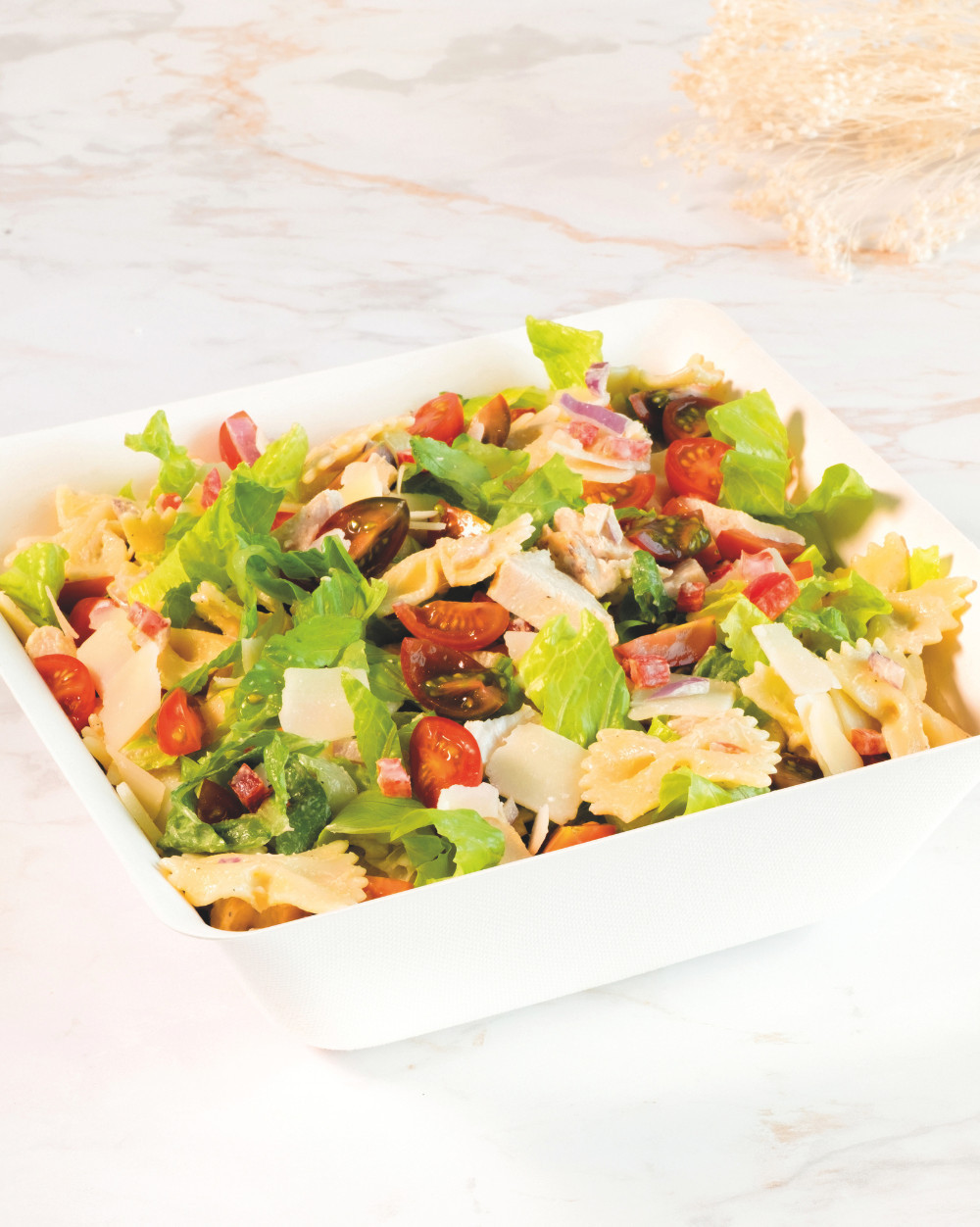 Farfalle pasta, roasted chicken, red peppers, red onions, parmesan, Caesar sauce