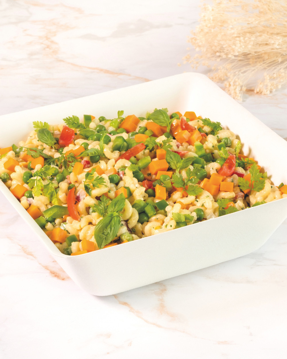 Coquillettes pasta, bell pepper mayonnaise cream, carrots, red onions, parsley