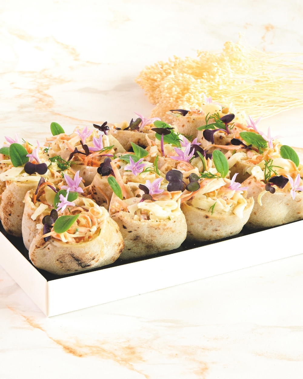 Coleslaw made with white cabbage, carrot, pickled cucumber, red onions, brown sugar mayonnaise, pita bread